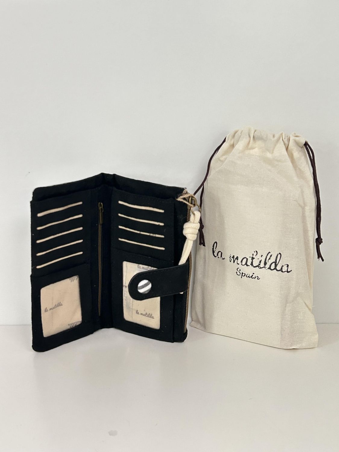 Cartera de tela con forro interior y cierre de cremallera. Ideal para billetes y tarjetas.