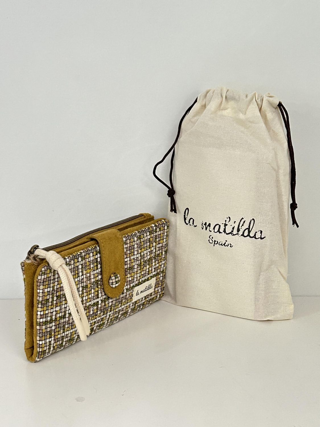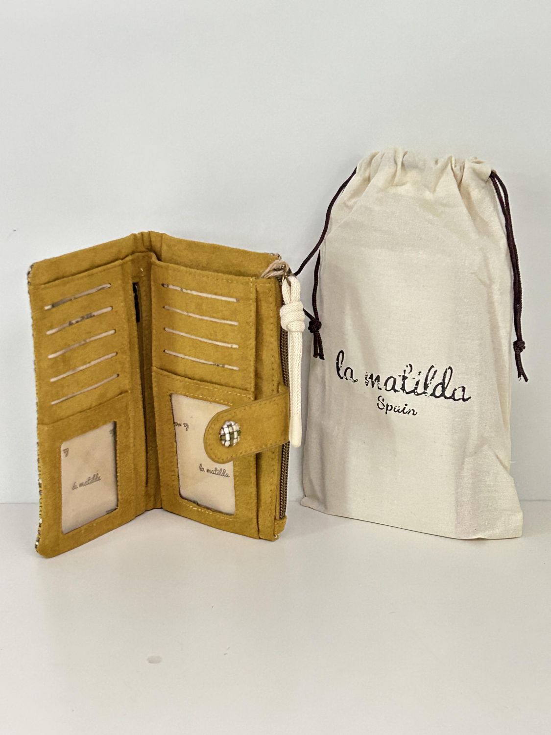 Cartera de tela con forro interior y cierre de cremallera. Ideal para billetes y tarjetas.