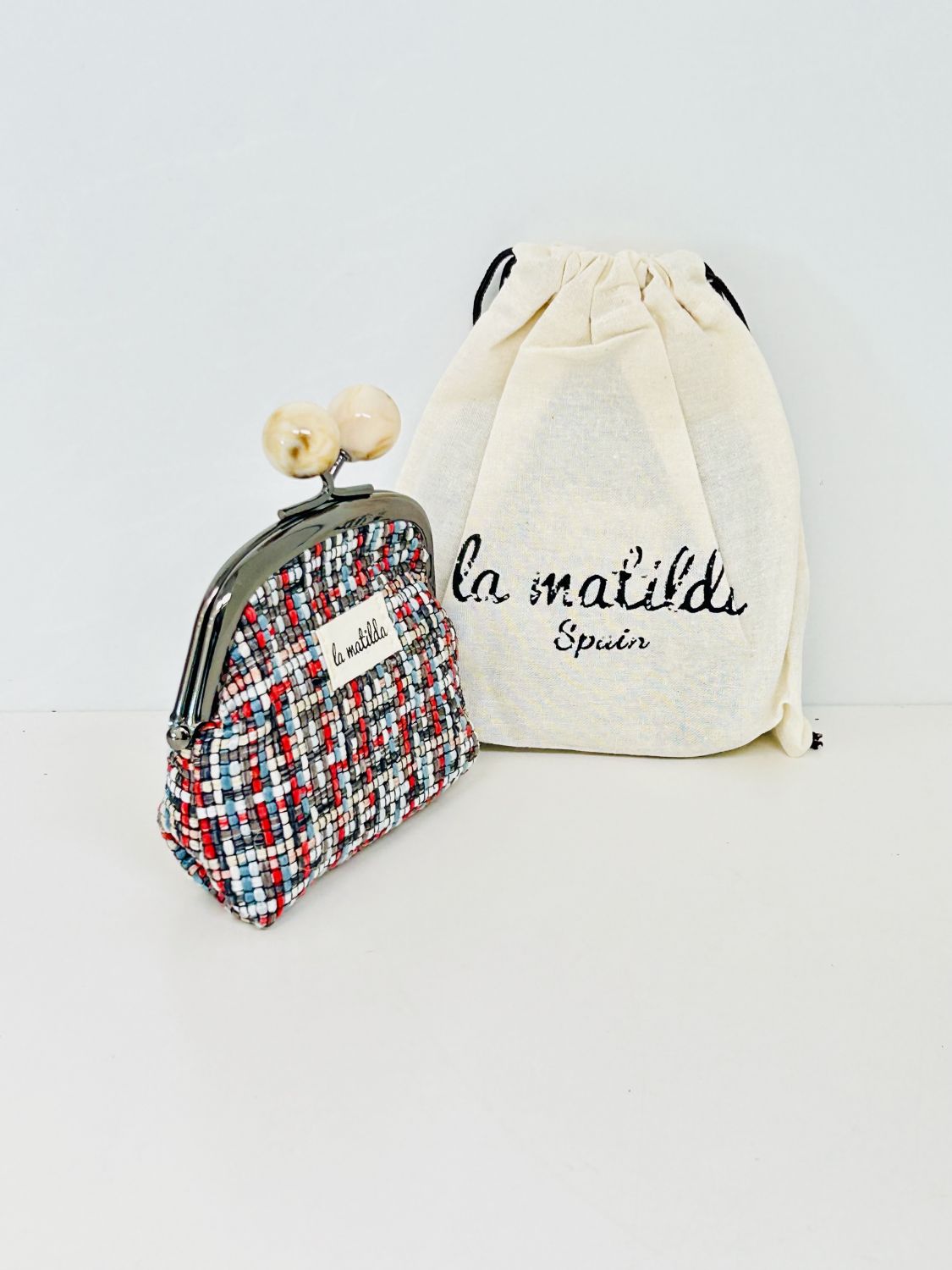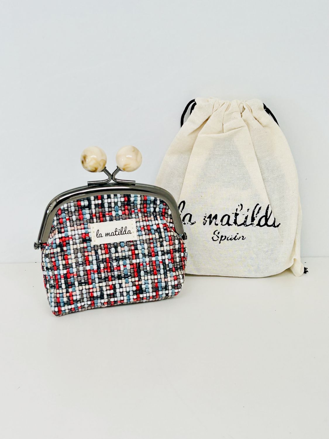 Monedero de tela con forro interior y estampado propio. Ideal para guardar monedas y pequeños accesorios.