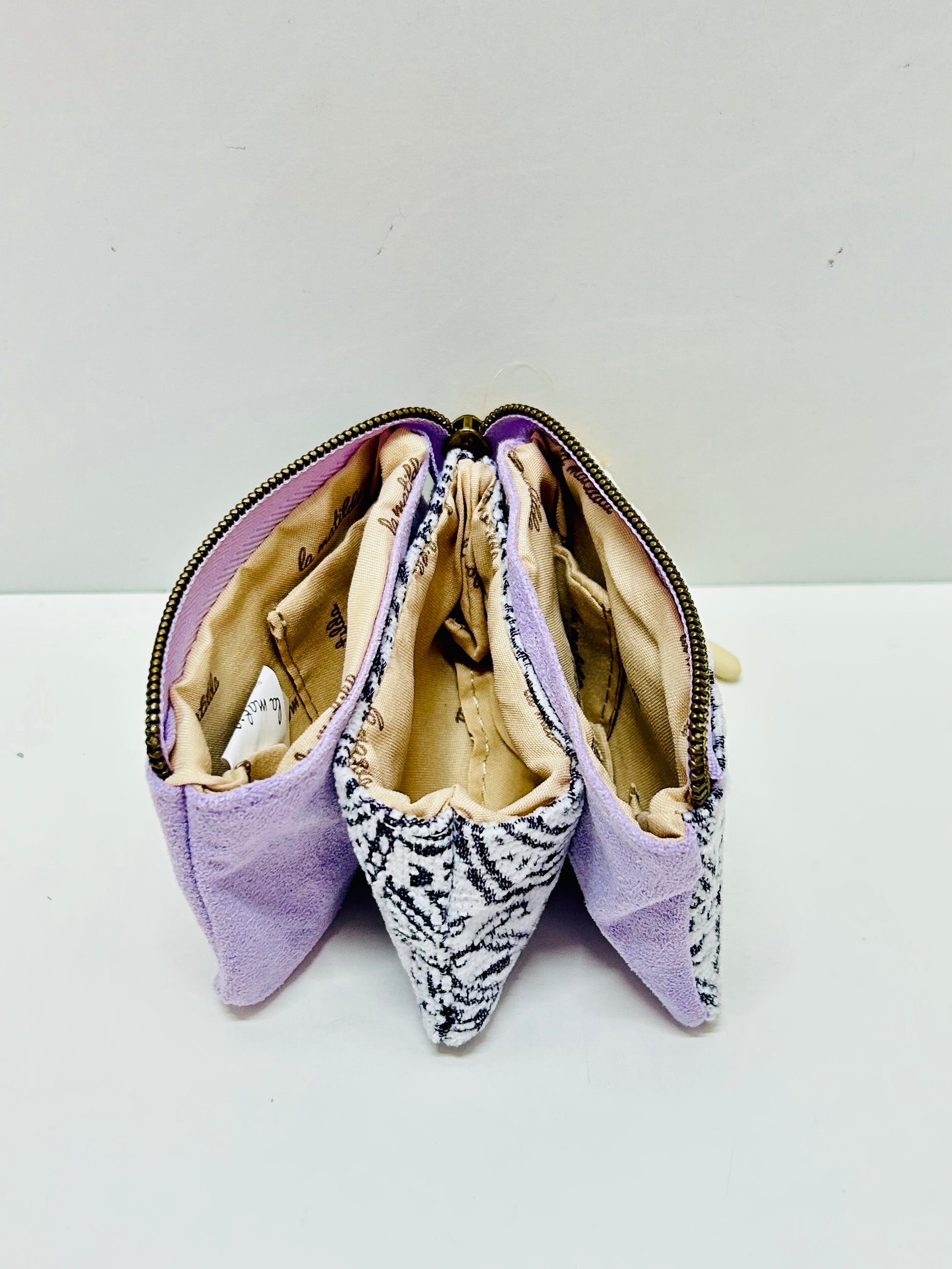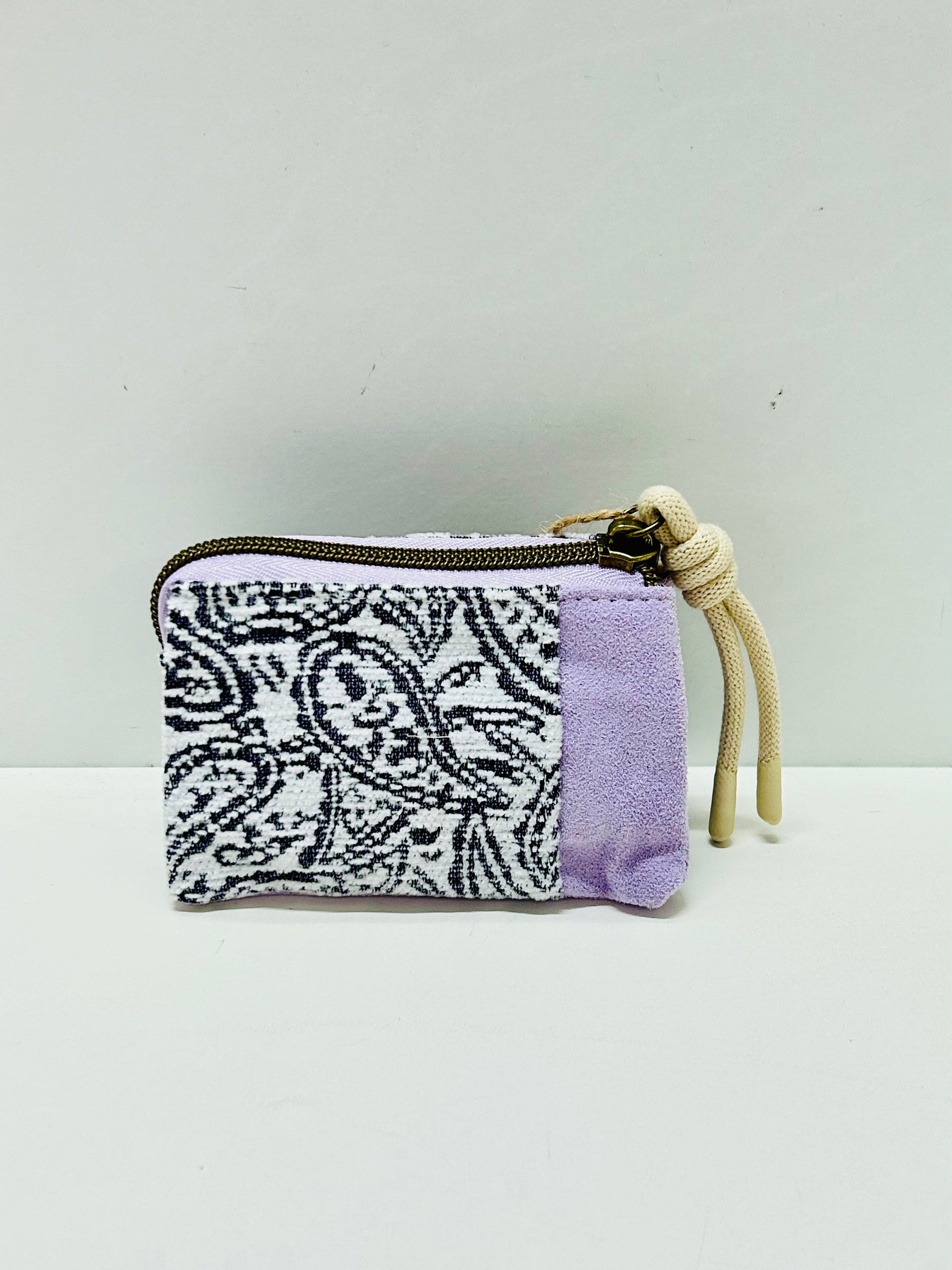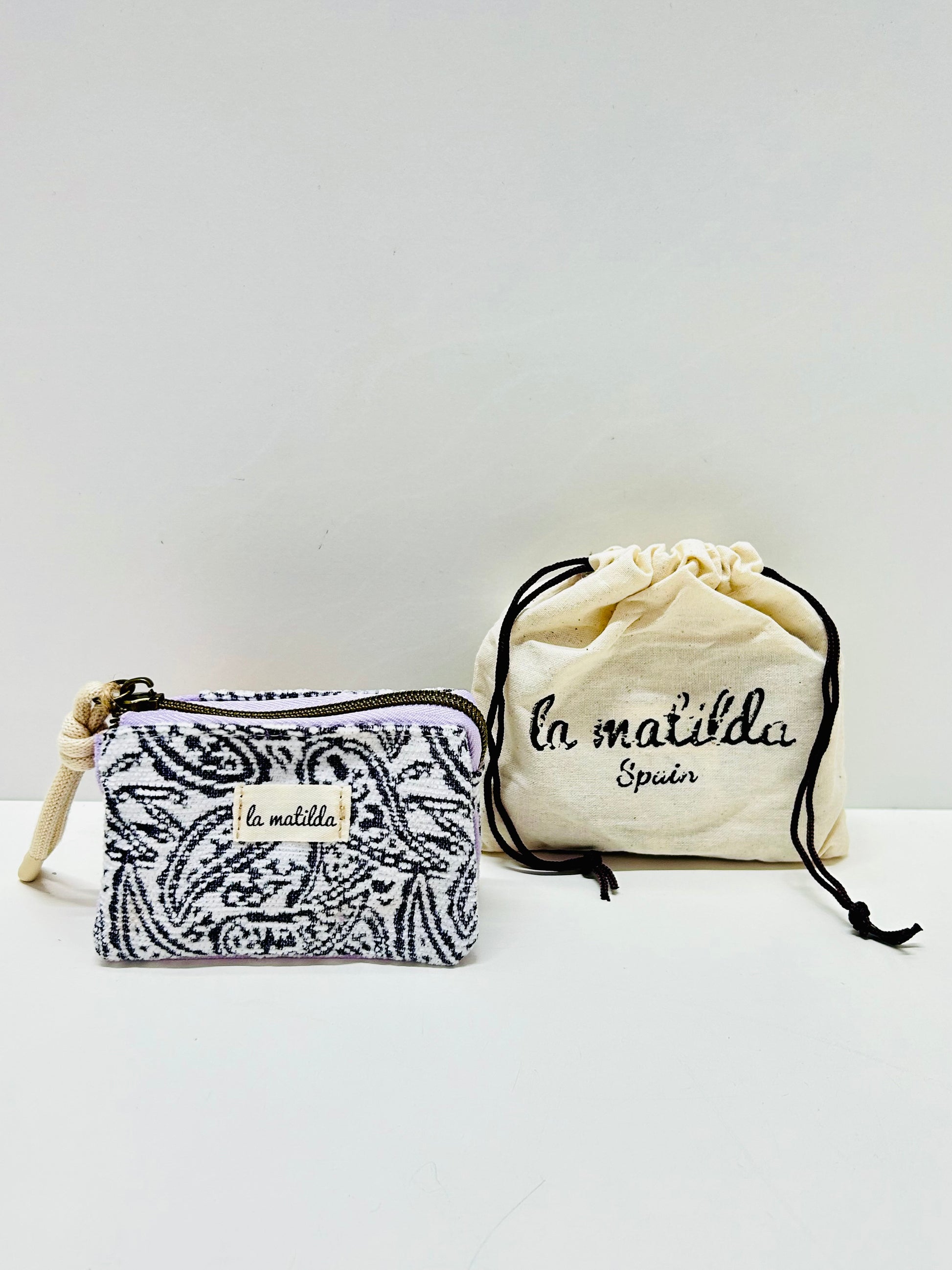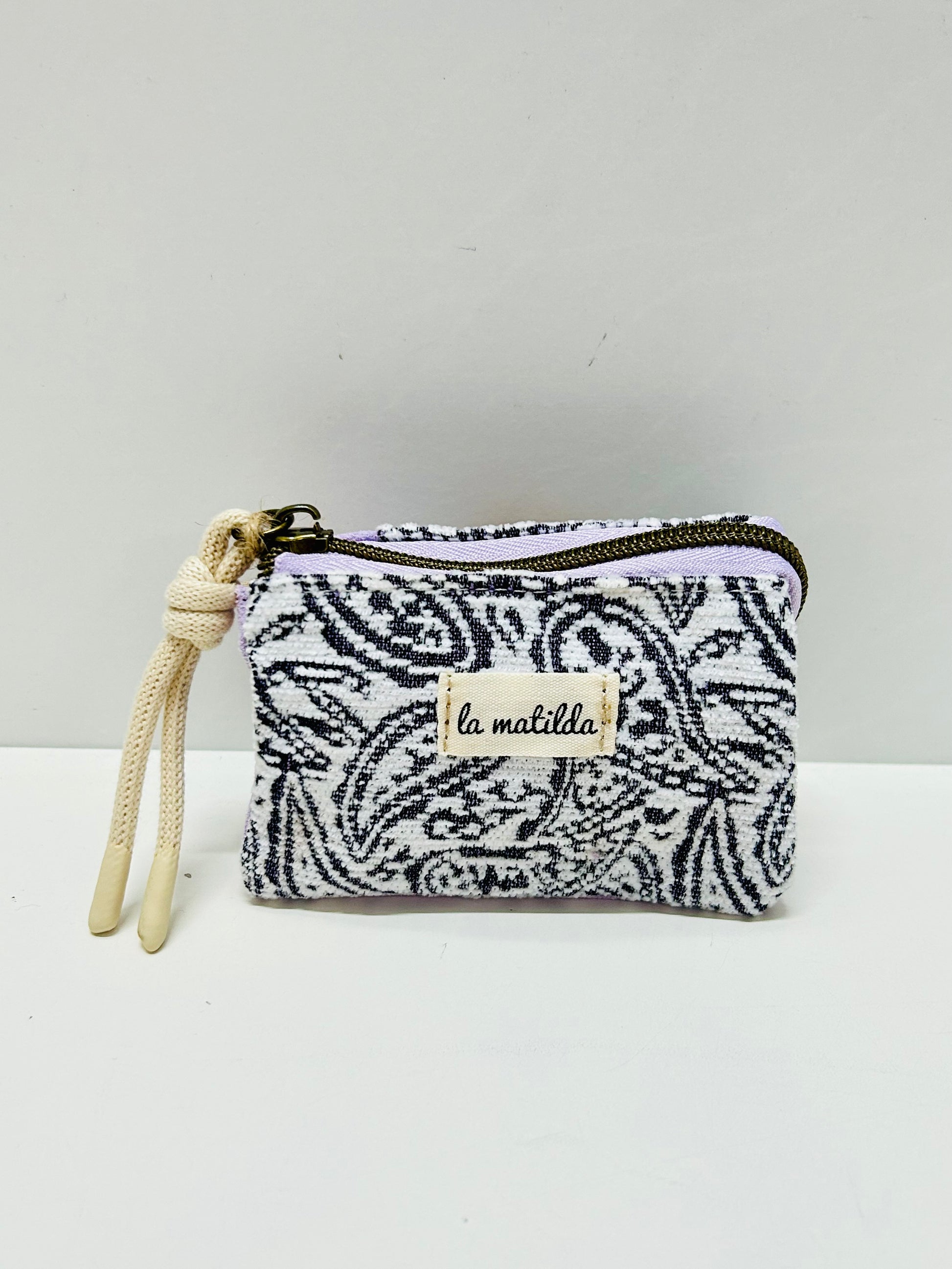 Monedero de tela con forro interior y cierre de cremallera. Ideal para guardar monedas y pequeños accesorios.