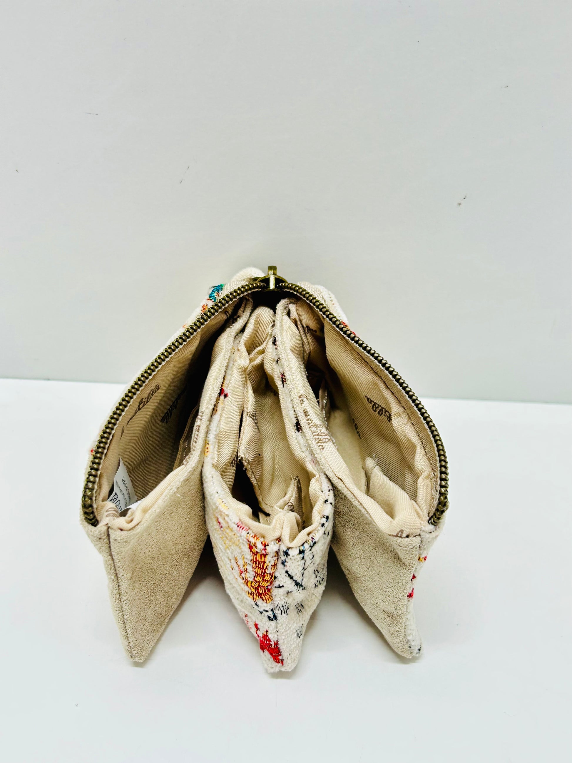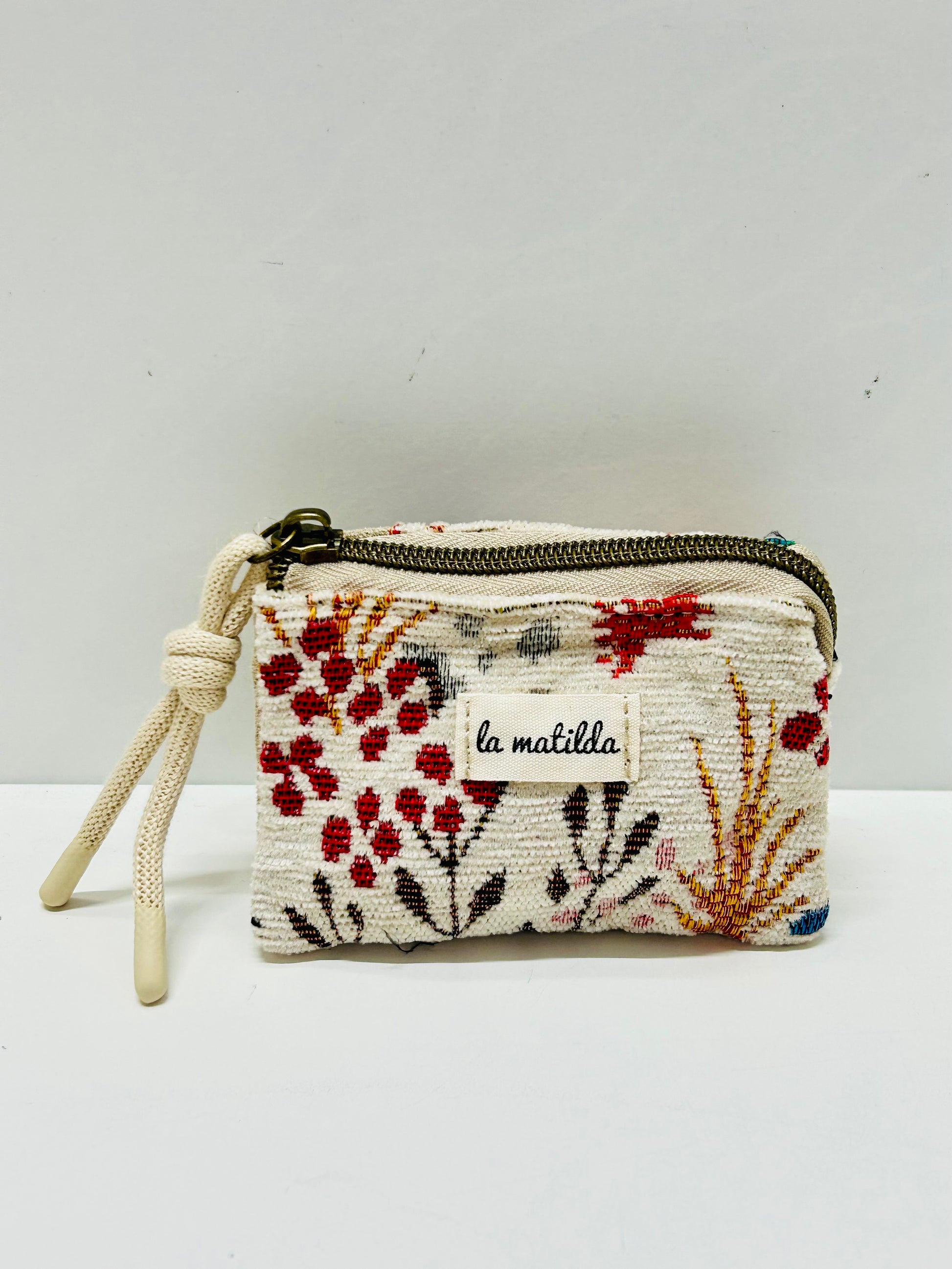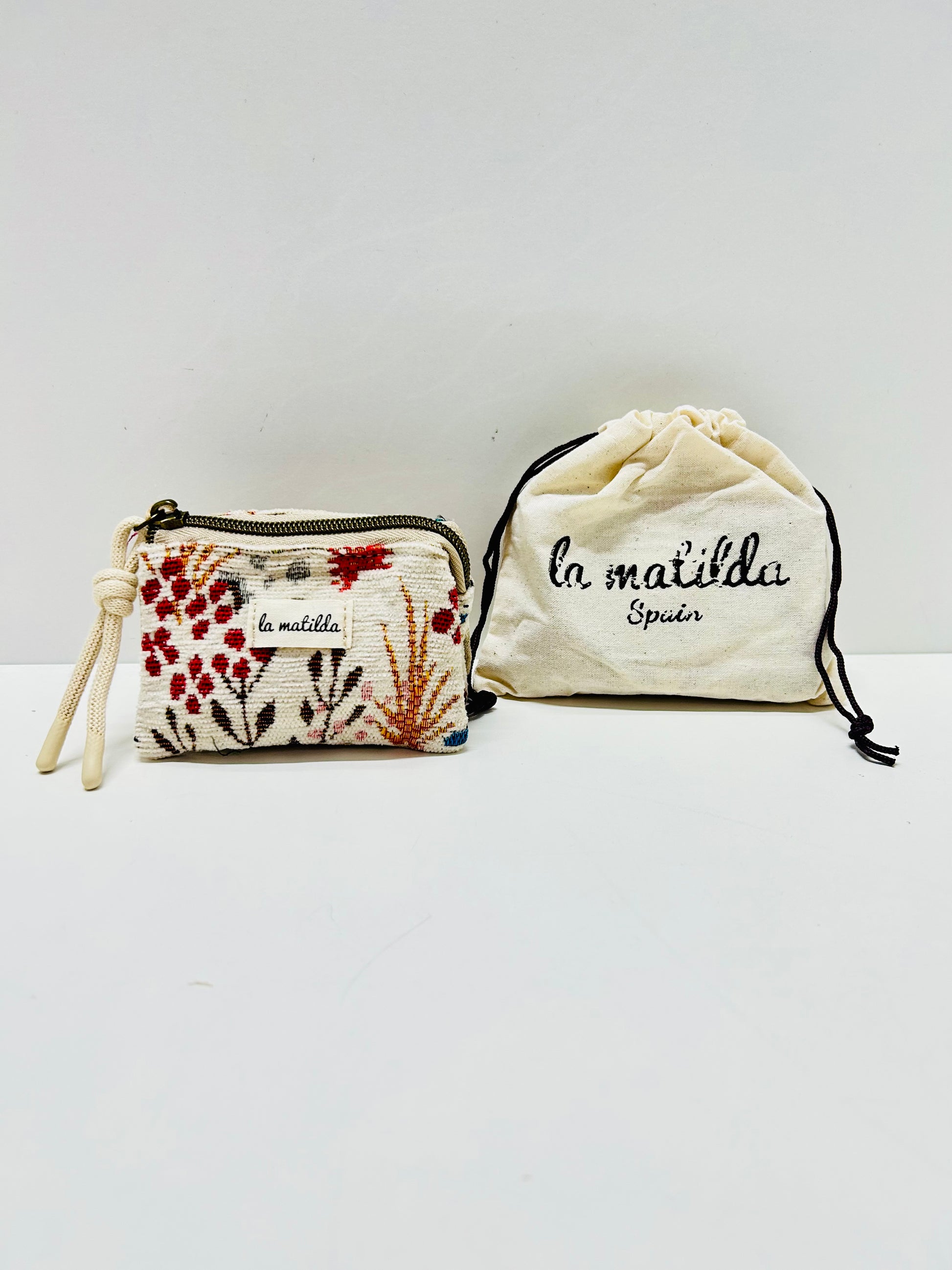 Monedero de tela con forro interior y cierre de cremallera. Ideal para guardar monedas y pequeños accesorios.