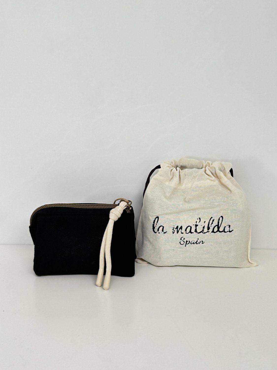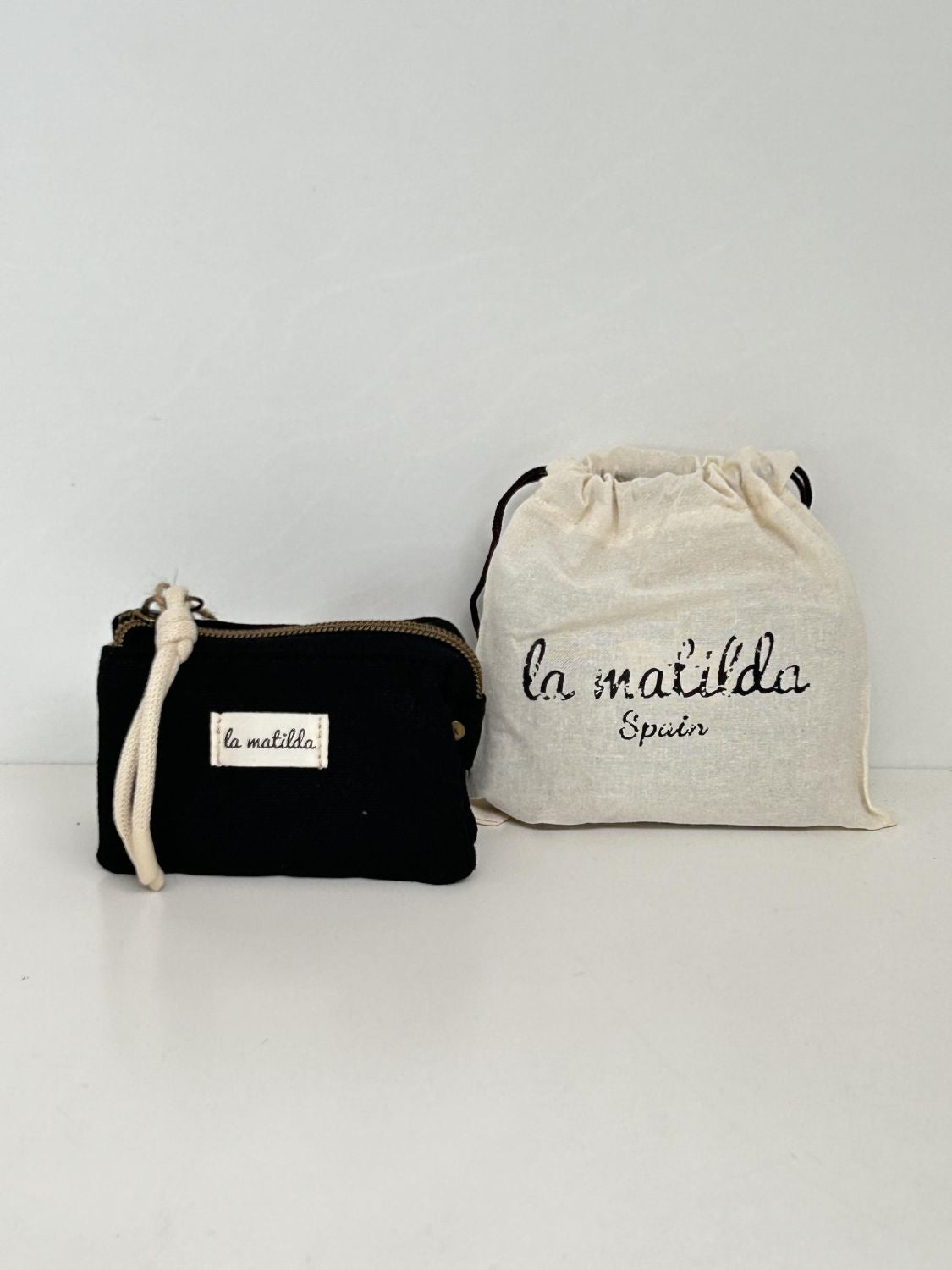 Monedero de tela con forro interior y cierre de cremallera. Ideal para guardar monedas y pequeños accesorios.