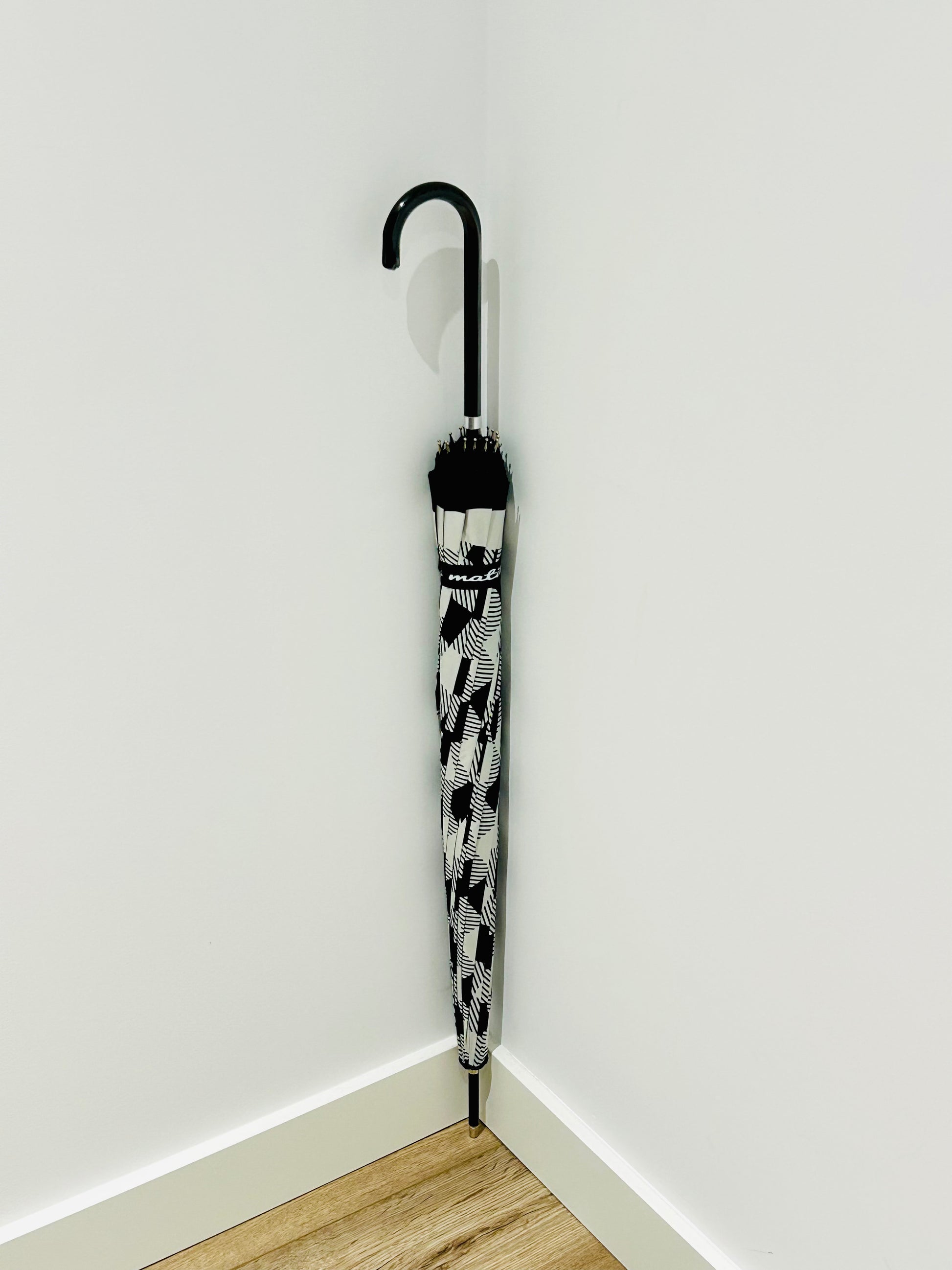 La empuñadura fina en forma de “J” aporta un toque sofisticado y un agarre cómodo, ideal tanto para los días de lluvia como para protegerse del sol gracias a su tejido con protección UV. La punta metálica refuerza la durabilidad y la cinta de cierre con el nombre de la marca añade el sello característico de la matilda, símbolo de estilo y funcionalidad.